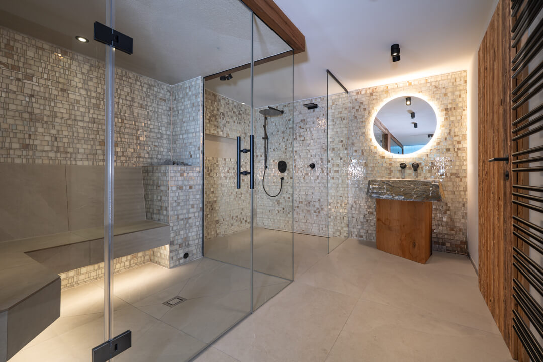 Dampfsauna und begehbare schwarze Regendusche mit Fliesen aus Muschelperlmutt