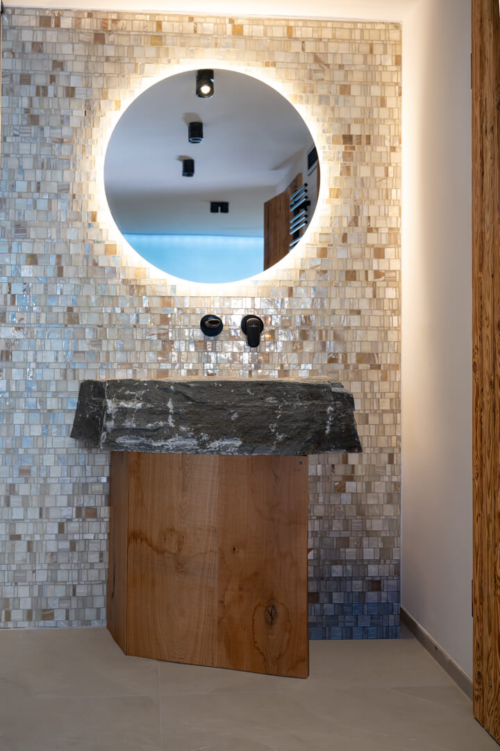 Massives Waschbecken aus Naturstein auf Eichenfuß mit Perlmutt-Rückwand.